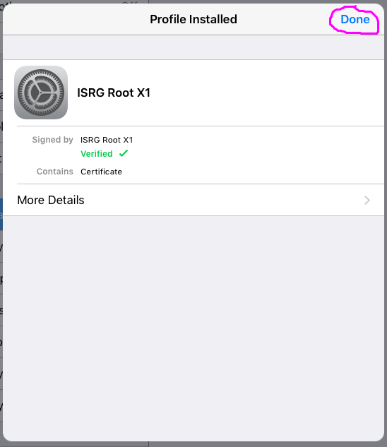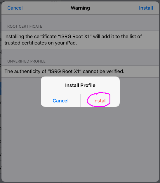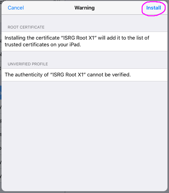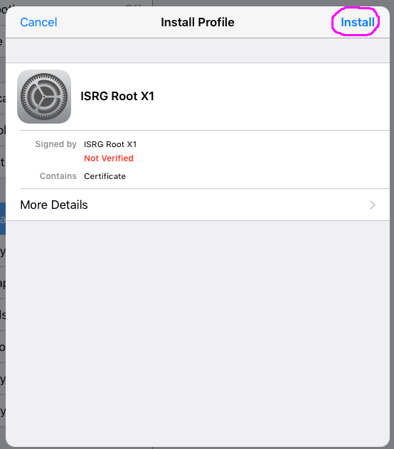 iPad2 (And other pre iOS10 devices) manual root certificate updateThe problem Older iOS devices (that have iOS9 or earlier) stopped being able to Sync to a STEARsoft Cloud server on 30th September 2021. For a detailed explanation scroll down past all the screen shots. The simple fix On the iPad in question, open safari and point your browser at https://letsencrypt.org/certs/isrgrootx1.pem You'll get a blank screen while it thinks about this and after a few seconds give you the Install Profile screen. Tap Install: