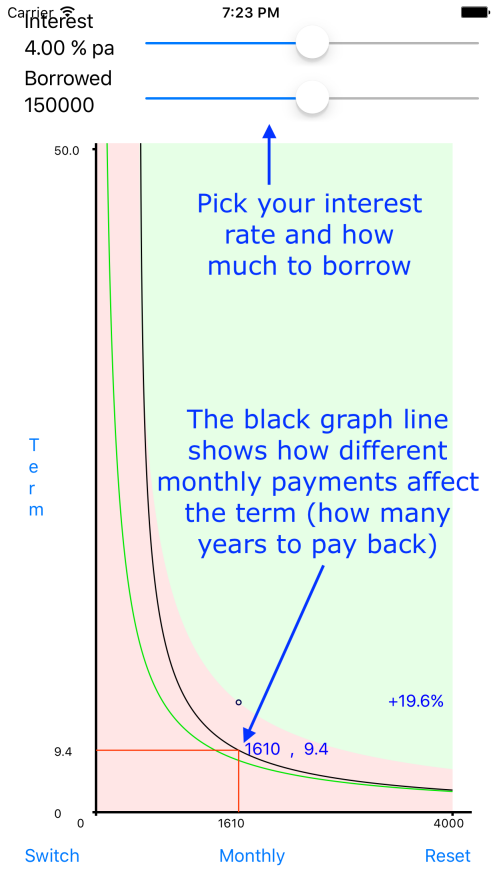 - The percentage and value on the right of the graph shows how much 'interest' is paid over the whole loan. The percentage is of the amount borrowed. This means if the red to green ratio is 1:1 (ie half-way up) you will have paid equal amounts of interest and capital payments. This will equate to 100% interest, because the interest added has been 100% of the original loan value.