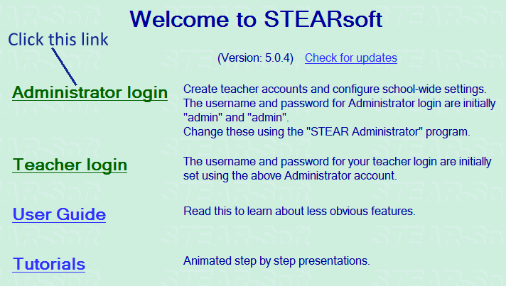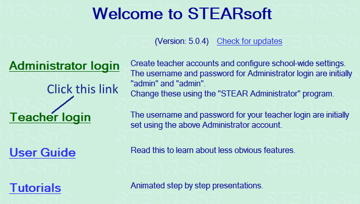 If you repeatedly get your password wrong, the account becomes locked. In this instance you must wait 10 minutes before trying again. Old versions of STEARsoft (before 3.1.8) didn't unlock themselves and required restarting STEARsoft (typically involving rebooting the PC). If you think this might be your problem, make sure you have the latest version of STEARsoft installed. Teacher username and passwordThis is initially chosen by the administrator when they create a user account: